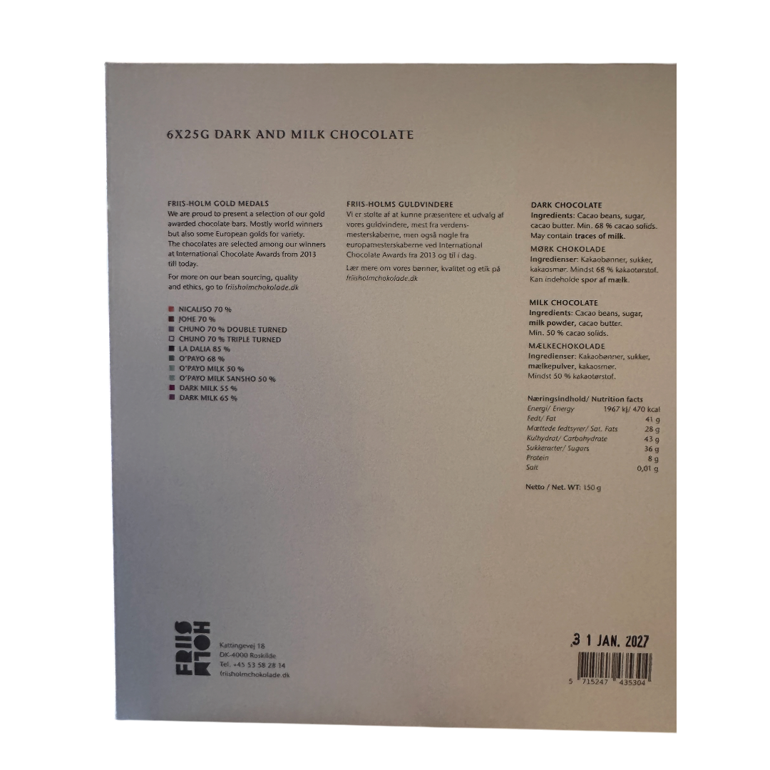 Dette er bogstaveligt talt et udvalg af noget af verdens absolut bedste chokolade. Hver af de fire chokolader, har i udvalget vundet en guldmedalje ved International Chocolate Awards! Dette udvalg indeholder 6 styks 25 grams barrer af: La Dalia 85 %, Chuno Double Turned 70 %, Chuno Triple Turned 70 %, Dark Milk 65 %, Johe 70 %, Nicaliso 70 %.