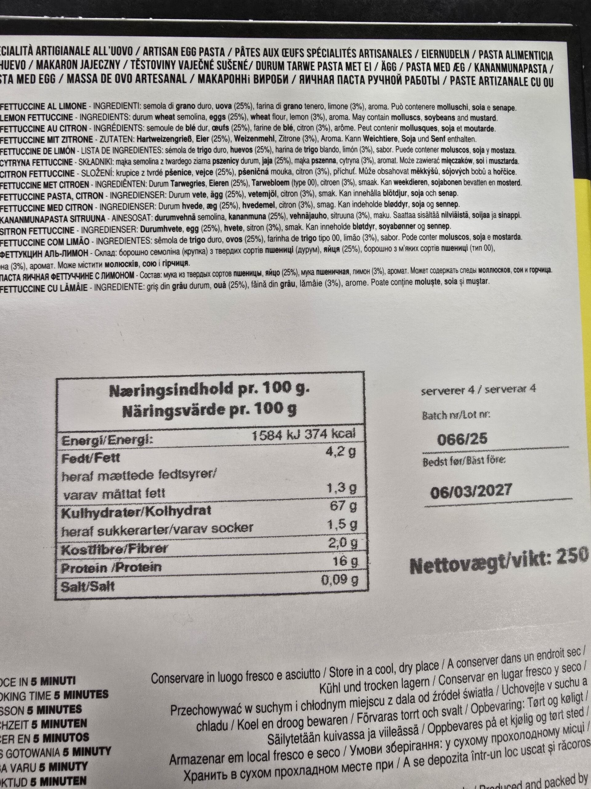 Denne pasta er lavet med saft fra sicilianske citroner. Pastaen er perfekt med en hvid skaldyrssovs eller med en fløde, skinke og ærtesauce