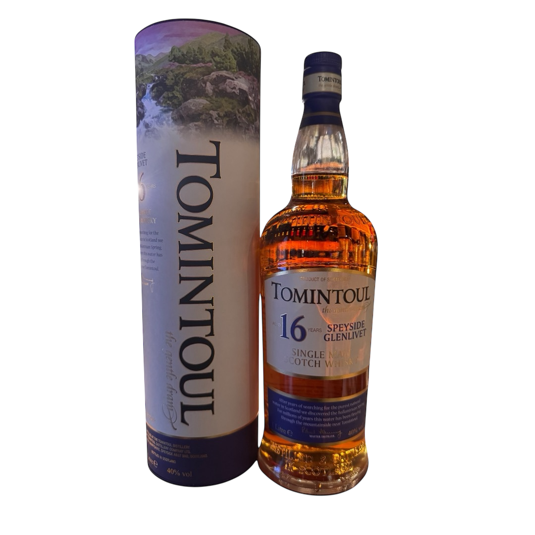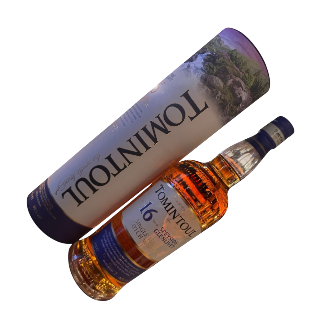 Tomintoul 16 års single malt Speyside i original gaverør, 1 liter flaske